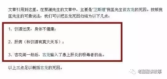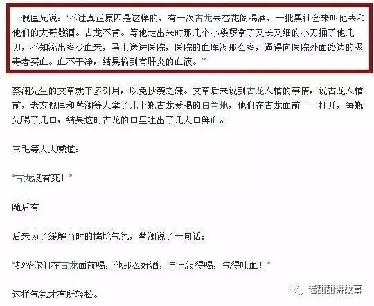 古龙一生放浪形骸,挥金如土,自年轻时就嗜色嗜酒,成名发达后更加无节制。后来染上肝病,健康逐渐走下坡路。其后又在台湾北投吟松阁饮宴时遭人砍伤,失血2000cc,又输入带有肝炎的血液,从此健康更加恶化。在1985年9月21日,古龙因肝硬化引起食道瘤大出血,下午六时不治,享年四十八岁。关于古龙死因,香港专栏作家蔡澜在一篇文章里有提及,大家可以参考一下。