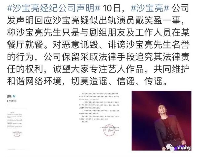 8月10日晚,沙宝亮终于对今天被传闻出轨某女星的事件作出回应了,他澄清这是谣言恶意诋毁,并且保留法律追究的责任。