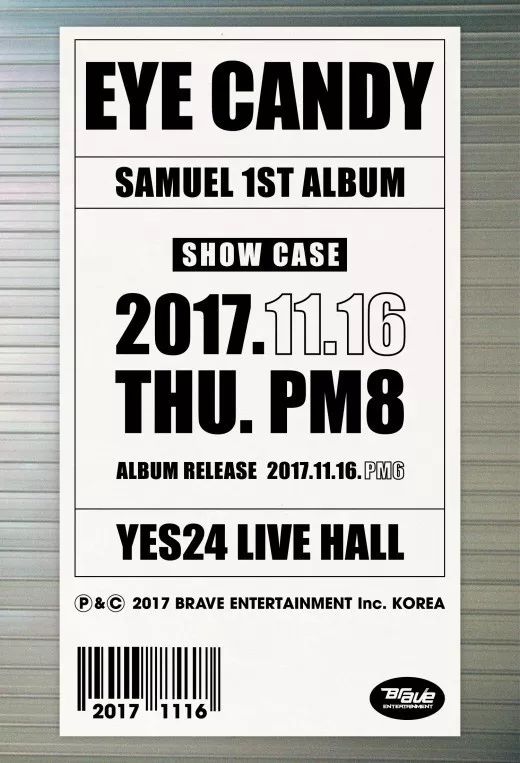SAMUEL的首张正规专辑‘EYE CANDY’是由BRAVE ENTERTAINMENT首长勇敢的兄弟旗下制作人们全力以赴了。新专辑带有SAMUEL展示作为SOLO歌手出色的认同性以及音乐方面的成长的觉悟。