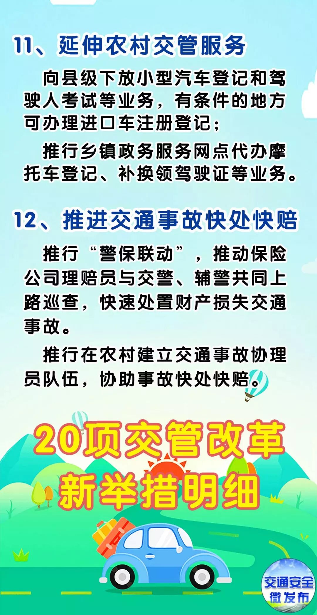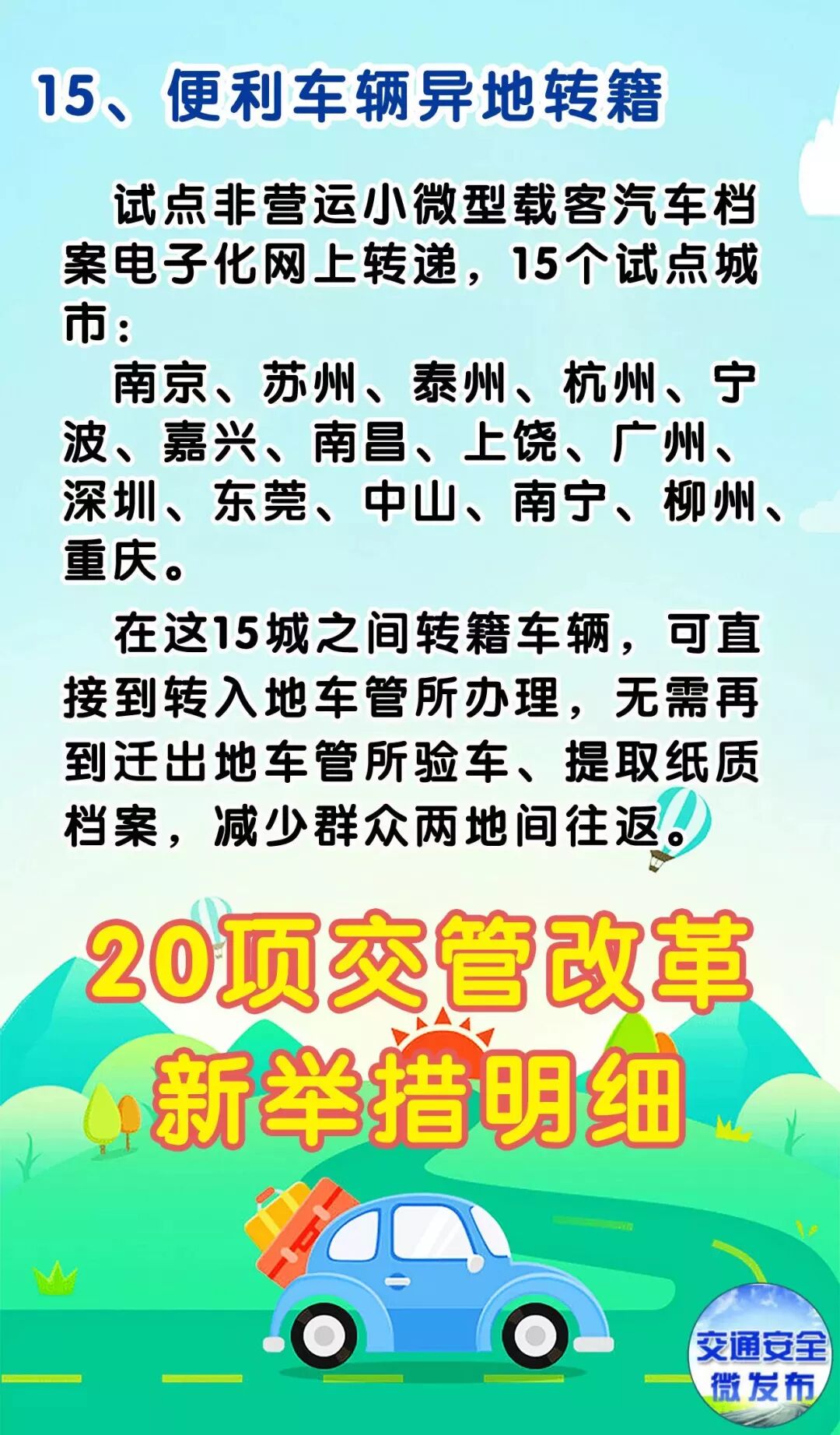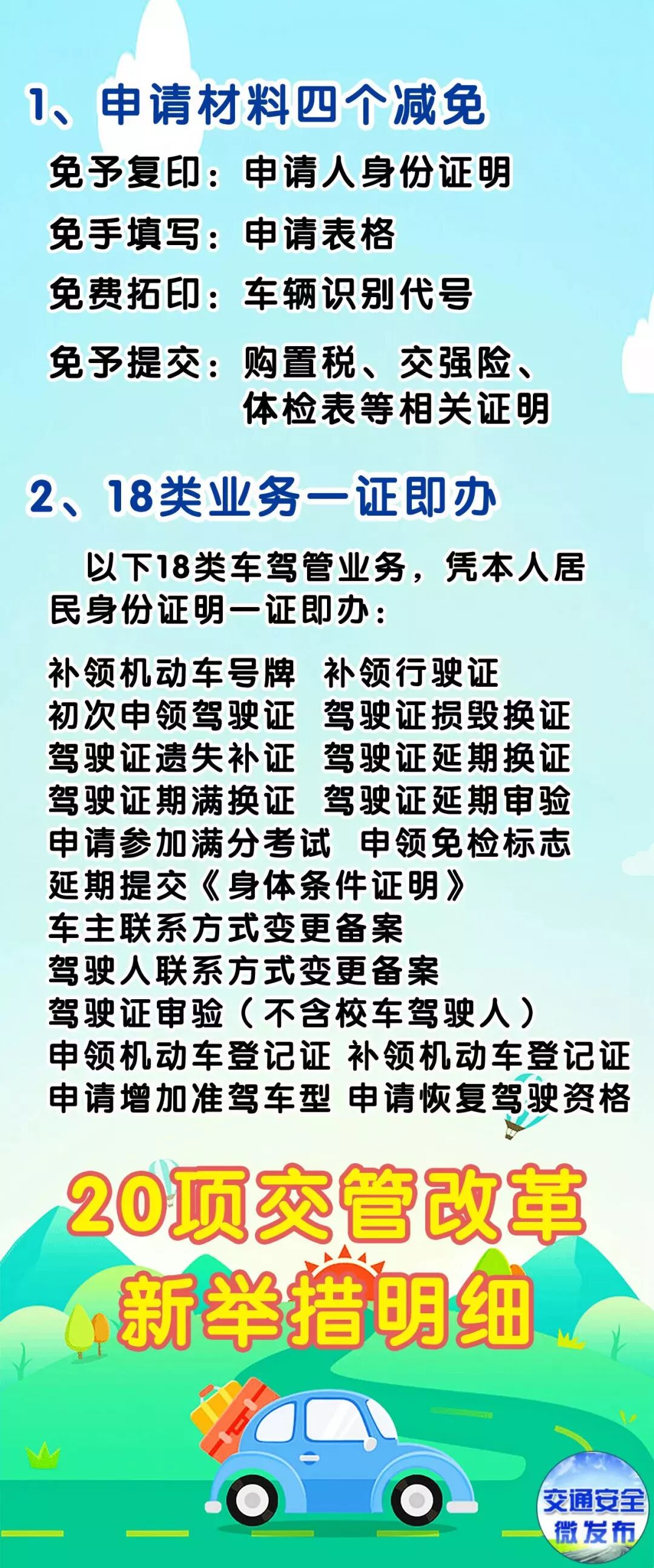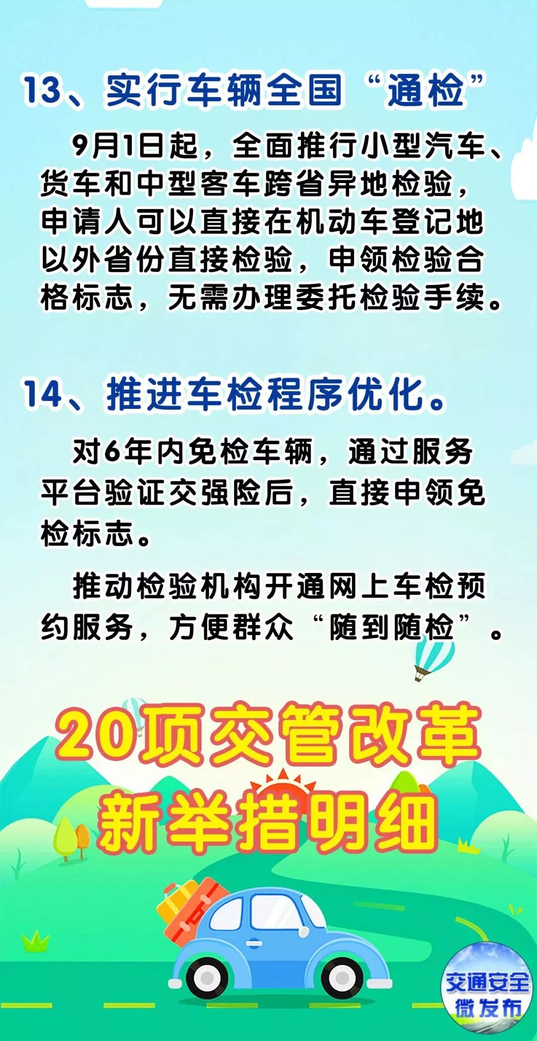 9月1日起,20项改革措施将在全国全面推行。其中,机动车全国“通检”、小型汽车驾驶证省内异地“通考”、机动车档案资料电子化转递等措施将使更多的机动车车主和申请驾驶证的人员获益。