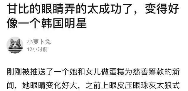 5月29日有网友就发表了自己对甘比近照的看法,该网友表示:刚刚被推送了一个甘比和她女儿为慈善筹款的新闻,她眼睛变化好大,之前上眼皮压眼珠灰太狼式的眼睛,显得无神,现在变成弯弯的那种眼型了!