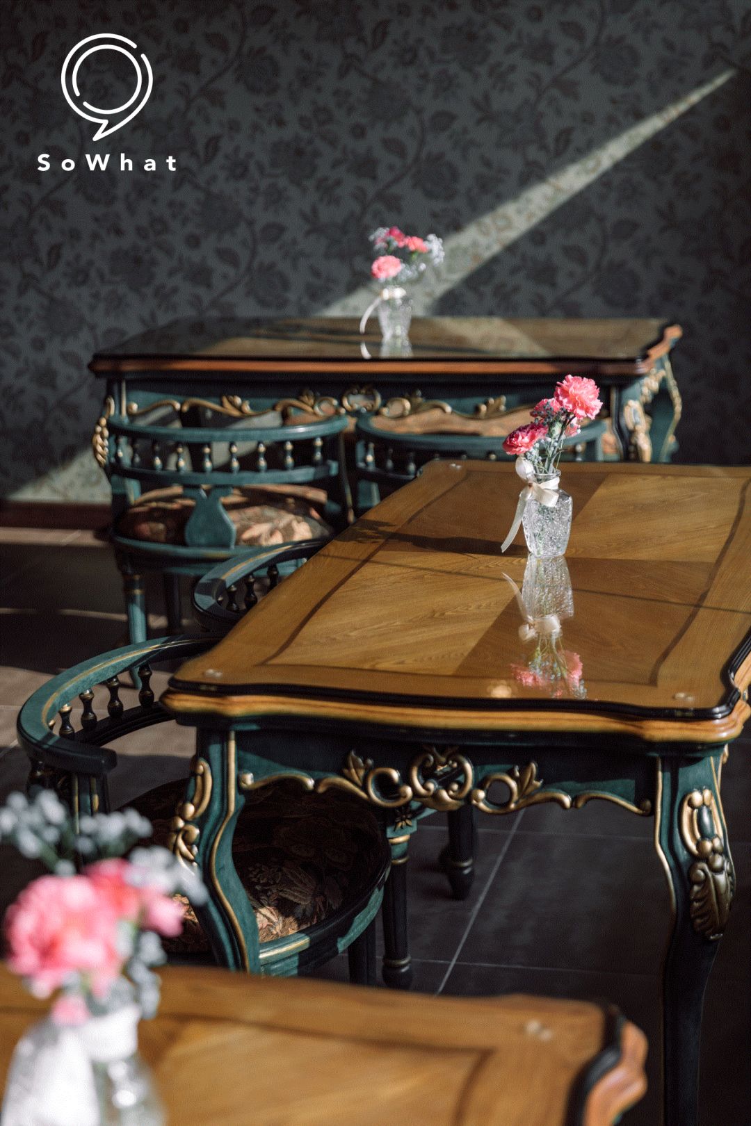 写字楼下低调门面,以墨绿色为主调,难得一见的vintage风格,融合了中世纪欧洲的桌椅和装饰,浓浓的复古情怀。