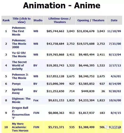 9月25日在美国院线上映的动画电影《我的英雄学院The Movie:2人的英雄》在美国票房达到了1,388,499美元,成为了日本动画电影在美国票房前十的电影,它超越此前宫崎骏所谓的引退作品《风起了》,而它之前还有《龙珠Z:复活的F》,话说日本动画在美国的票房也是挺难用我们阳光去看待的。