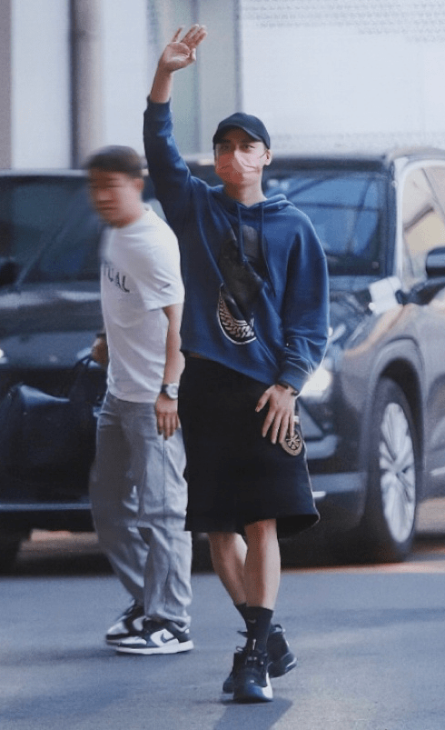 他身穿蓝色卫衣、黑色短裤,头戴鸭舌帽现身,直接向在旁等候的粉丝打招呼。