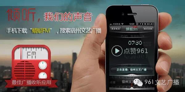 手机下载“蜻蜓FM”软件,点开软件,再搜索“宿州文艺广播”,点左下角的节目单,找到《点赞961》就可以收听啦!如果没有时间收听直播,也可以把前一天的节目下载下来,有空的时候再听。