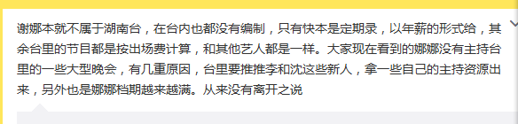 至于谢娜,小编查了下资料,谢娜与芒果台只签了《快乐大本营》的节目约,今年是否续签还不清楚,所以走穴主持也是正常行为,与东方卫视签的也是季播节目打包价。