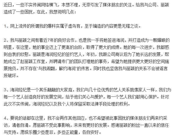 当时有粉丝公开了与赵丽颖前前经纪人的对话