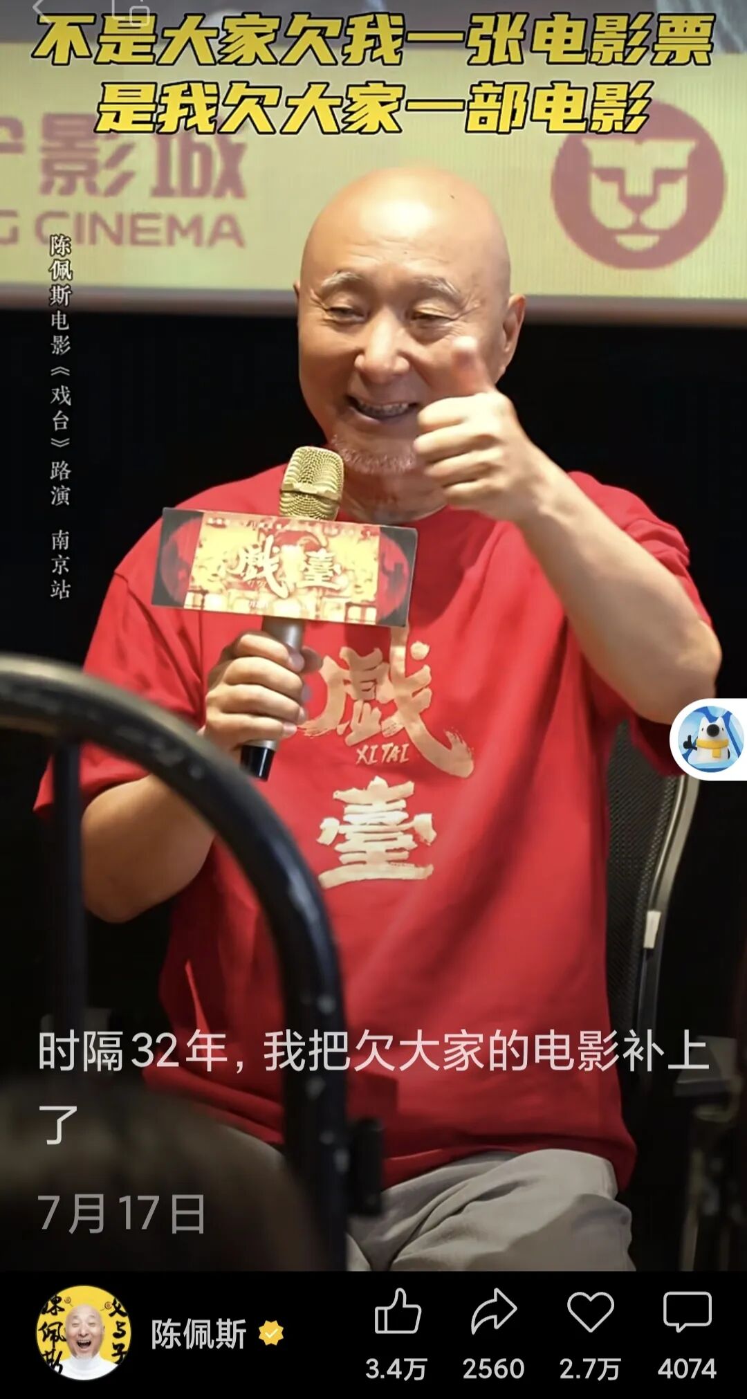 路演的现场,有老粉丝说:“终于补上了欠陈佩斯的一张电影票”,台上的陈佩斯赶忙纠正,“不是您欠我的一张电影票,而是我欠大家的电影票。”