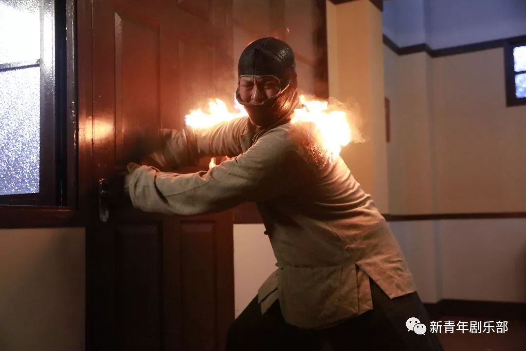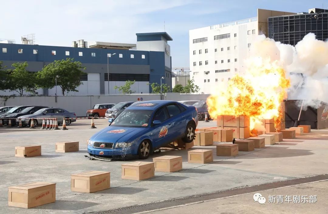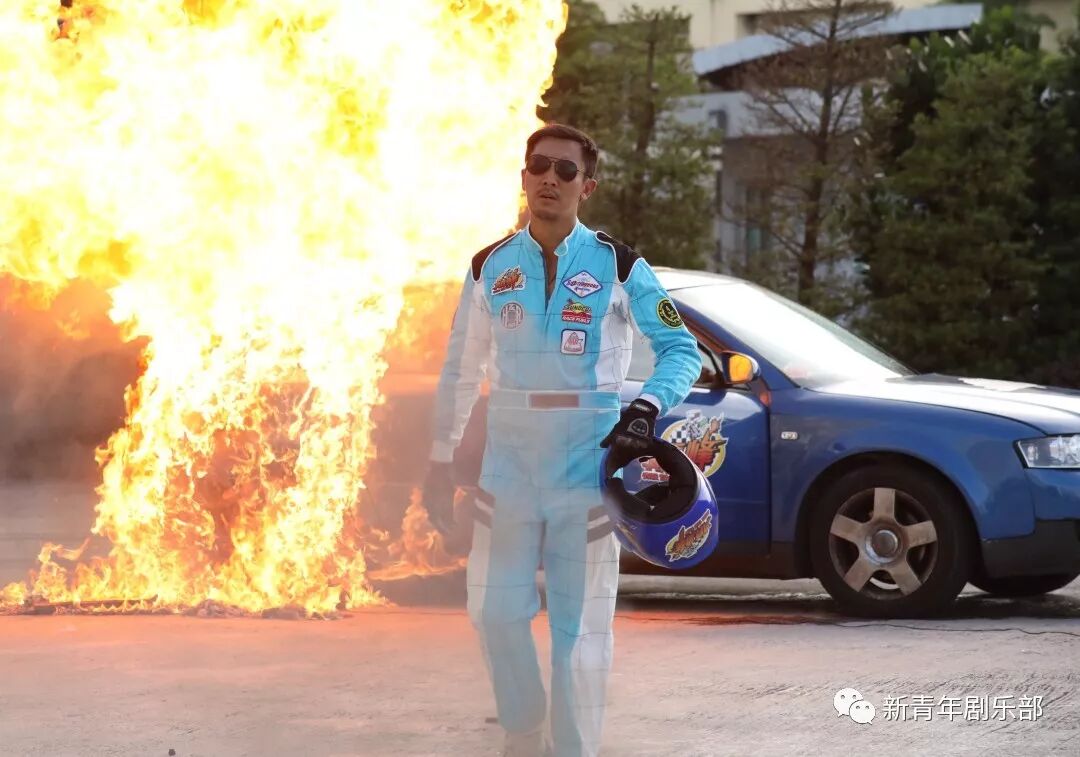 在拍摄现场热烈的掌声中,大志哥驾车飞越十几个爆点,最后汽车爆炸、燃尽,身穿车手服的他却安然无恙大步流星步出片场……