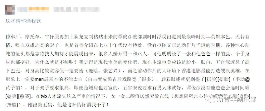 现在的男星主流审美是脸小、肤白,五官深邃,鼻子高下巴兜,对身高比较宽容但一定要瘦;但早年香港动作片的大环境下,最能打造的是硬汉英雄,身材高大、肤色健康,肌肉饱满结实,谭俊彦颇符合“大志哥”要有的“男人味”。