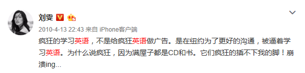 一开始英语很差,国内学的是表演,留学读的专业却是传媒经济学,到了国外发现自己不仅上课,连正常与人交往都成问题,于是她就开始练英语。
