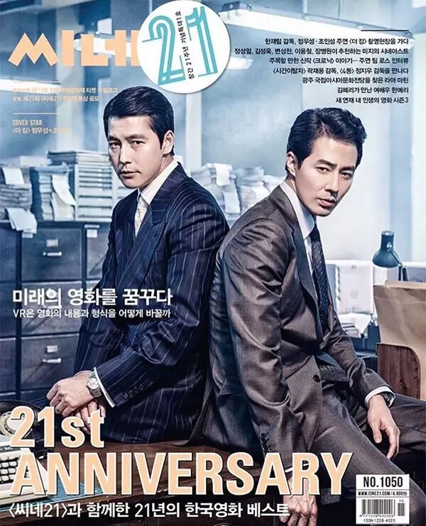 为了纪念电影杂志《CINE21》创刊21周年,郑雨盛和赵寅成一起拍摄了帅气的封面照。公开的照片中,两人身穿正装,干净利落的发型和雕刻一般的外貌让人惊叹。