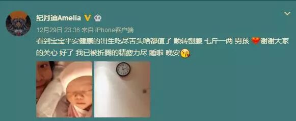 29日晚,纪敏佳@纪丹迪Amelia 微博宣布产子喜讯,并晒出和宝宝的合照,称“看到宝宝平安健康的出生吃尽苦头啥都值了,顺转剖腹,七斤一两,男孩,谢谢大家的关心。”