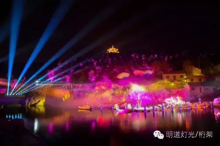 整场演出分为序幕、第一幕、第二幕、第三幕、第四幕、第五幕、第六幕共七个篇章,从女娲传说、羿射九日、月宫仙女到轩辕与蚩尤金戈铁马的厮杀,从大禹治水、凤凰涅槃到龙王嫁女、八仙贺喜,从太平禅寺佛光普照、金碧辉煌到5000吨水从天而降、六面巨鼓悬挂,每一个场景,每一个画面无不体现明道灯光映衬下的《华夏传奇》在视觉上是多么令人震撼。