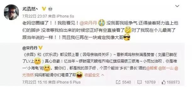 22日晚,曾饰演《家有儿女》中夏雨一角的尤浩然也转发宋丹丹微博,写道:“没我哥我姐争气还得接着努力追上他们的脚步没准等我拍出来的时候您正好有空直接看了[偷笑]对了我现在个儿最高了跟当年说的一样!!而且我仨再在一块肯定我像大哥。”