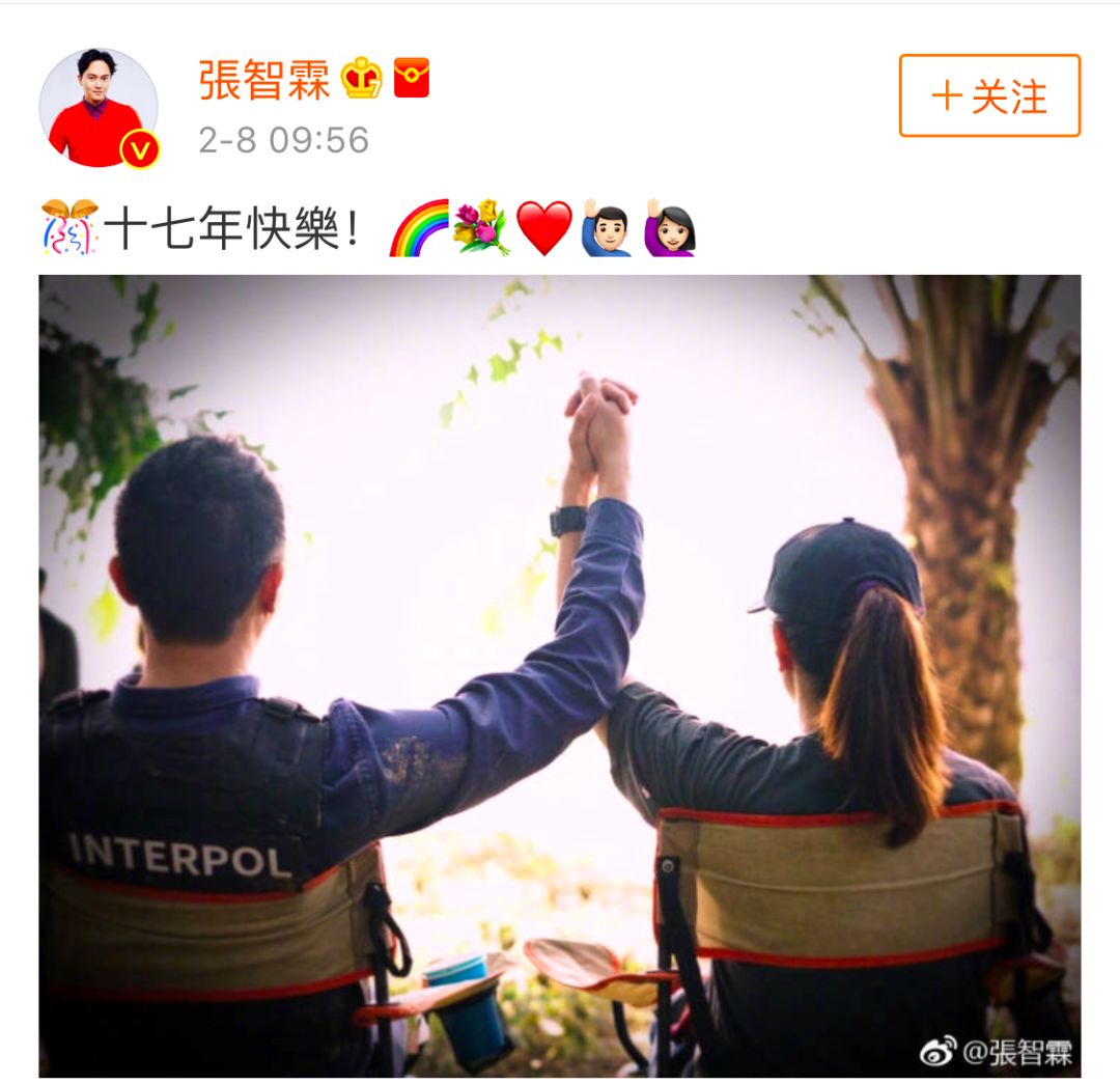 今天刷手机的时候,突然看见张智霖在微博晒出和袁咏仪的牵手照,并配文称“十七年快乐!”