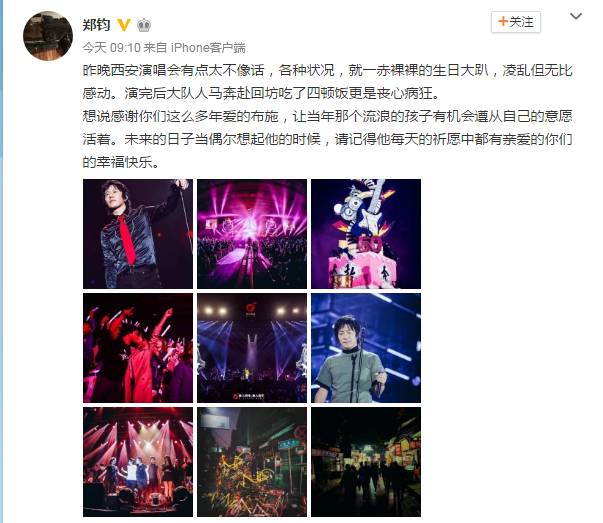 11月4日晚,距离郑钧50岁的生日只差两天,1967年出生,快50岁的郑钧,选择了在家乡西安来迎接“知天命”的年纪,郑钧昨晚也在微博分享了这一次西安演唱会的心得: