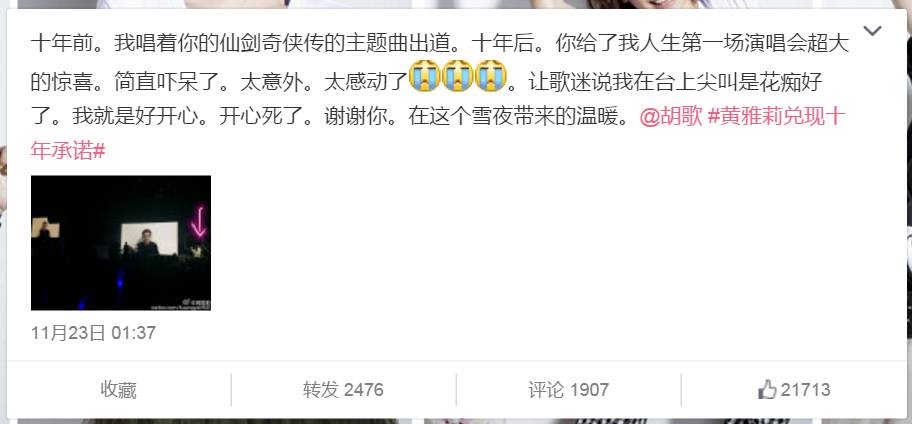 没错,这个人就是胡歌。当黄雅莉在超女的比赛现场,唱着《仙剑奇侠传》的主题曲《杀破狼》一鸣惊人时,意欲往歌坛发展的胡歌,恰好也在关注着那场声势浩大的比赛。彼时的胡歌尤其看好黄雅莉,并自称是“荔枝”(黄雅莉粉丝名)。而今,都经历了不同寻常的十年之后,在黄雅莉的首个个唱现场,胡歌也为他一直喜爱着的黄雅莉,送上了超大惊喜。