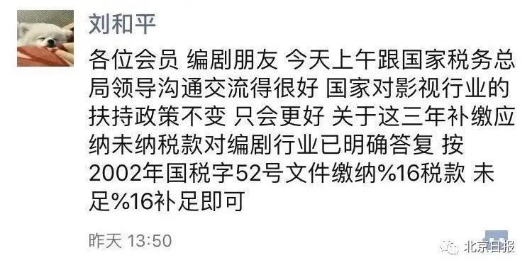 昨天下午,中国电视剧编剧委员会会长、著名编剧刘和平发布了一条朋友圈透露,昨天上午,部分编剧委员会会员和国家税务总局领导进行了沟通,“国家对影视行业扶持政策不会变,只会更好。关于三年补缴应纳未纳税款对编剧行业已明确回复:按2002年国税字52号文件缴纳16%税款,未足16%补足即可。”
