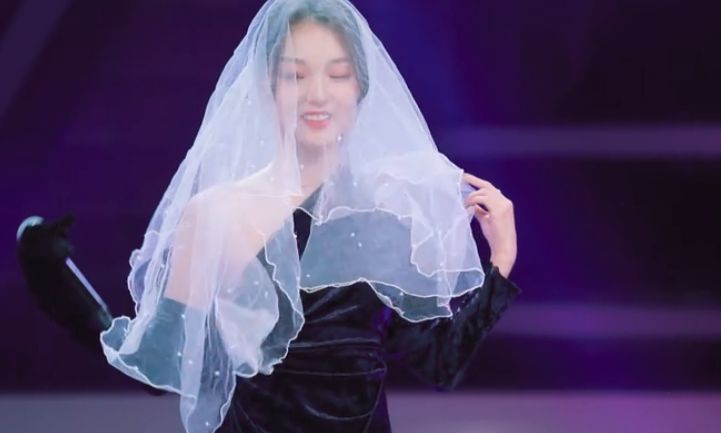 选手强东玥唱完张清芳的经典老歌《出嫁》后,拿出条白纱巾盖住自己的头。