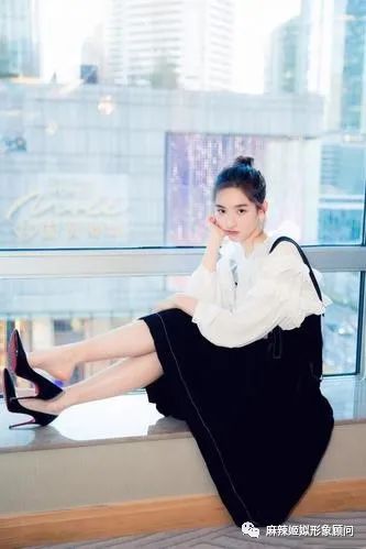 而这一图的王玉雯,扎个丸子头,用白色宫廷风衬衣搭配黑色吊带裙,加上她的黑色细高跟鞋,还有挺适合她的妆容,这个造型中的她,是不是一看就高级一看也有灵气?这样造型的王玉雯是不是即使是坐着的,看上去也比上图的她要高挑得多?