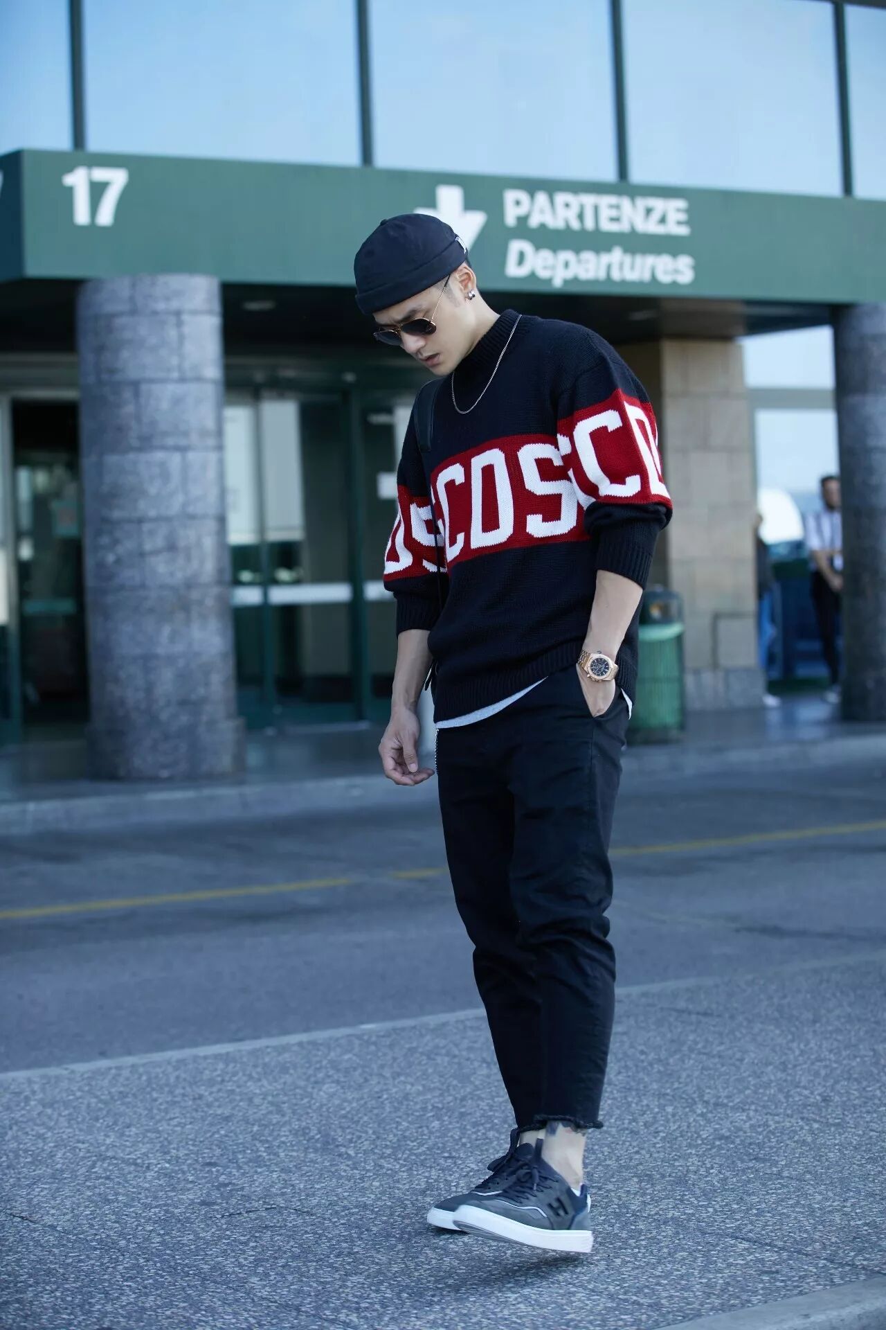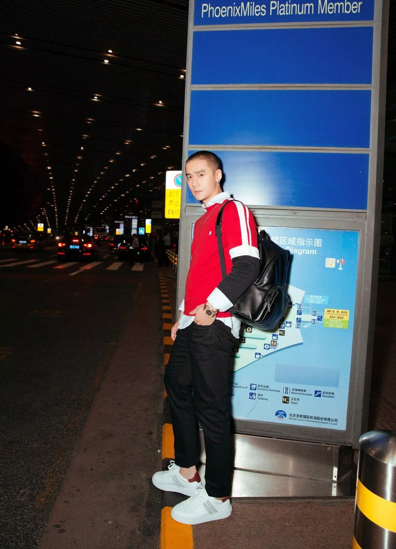 夫仔在平常的穿搭中就很见穿搭功力,机场红色上衣有种点亮机场的感觉,搭配品牌2017秋冬H-ONE系列小白鞋潮味十足,男士双肩包更衬高级的质感。