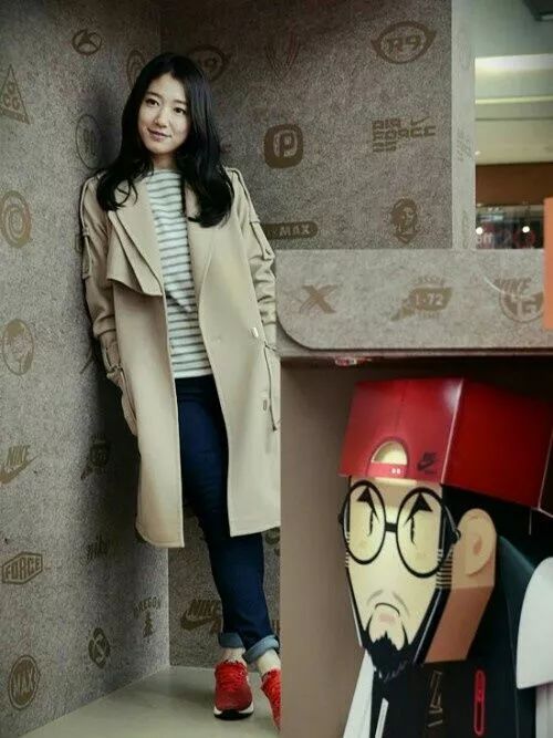 朴信惠的脸,但其实长得还是挺好看的,但是笑起来的时候脸上的肉也是比较明显,在穿衣打扮方面一直以来都是比较简约,里面穿了一件条纹的衣服,下面搭配的就是一条深色的牛仔裤,最吸引大家眼球的应该是脚上穿的那双红色的运动鞋。