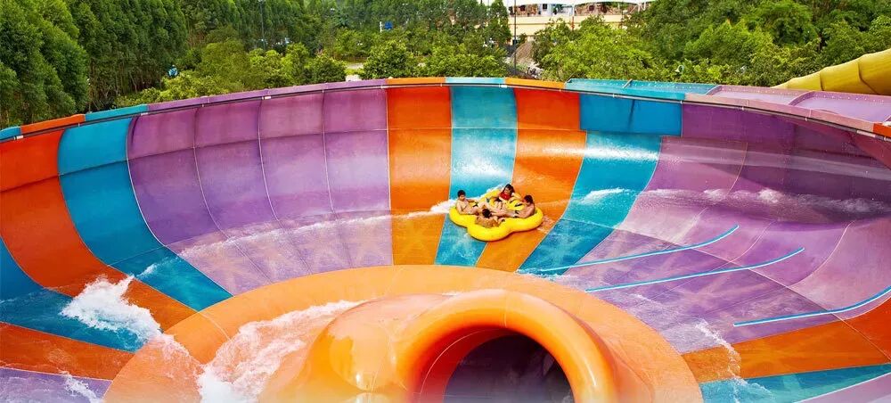 离心滑道沿着高高的山坡,蜿蜒而立,乘坐特别设计的双人浮圈,通过110米管道,一路上旋转加速,充分感受离心力后,再经过曲形管道,冲入下面的水池。最适合男女朋友共同体验!