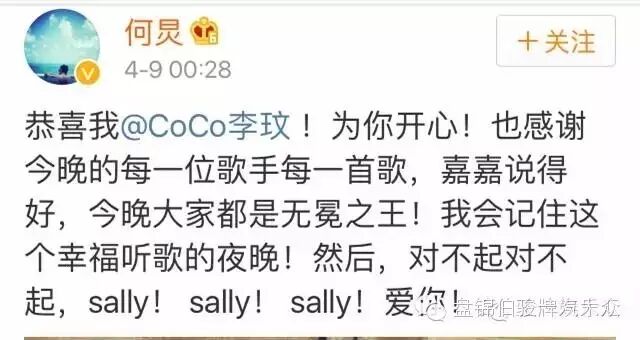 我是歌手》第四季总决赛现场直播主持人只有何炅,四个小时全场直播场内场外满场跑,即使是经验丰富的他也不免出现了如“今天花王花落谁家”、“歌王资(之)战”等口误,还将叶倩文的英文名Sally说成了Lisa。