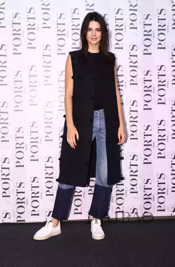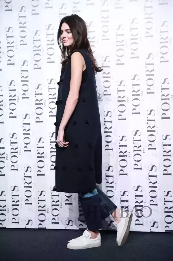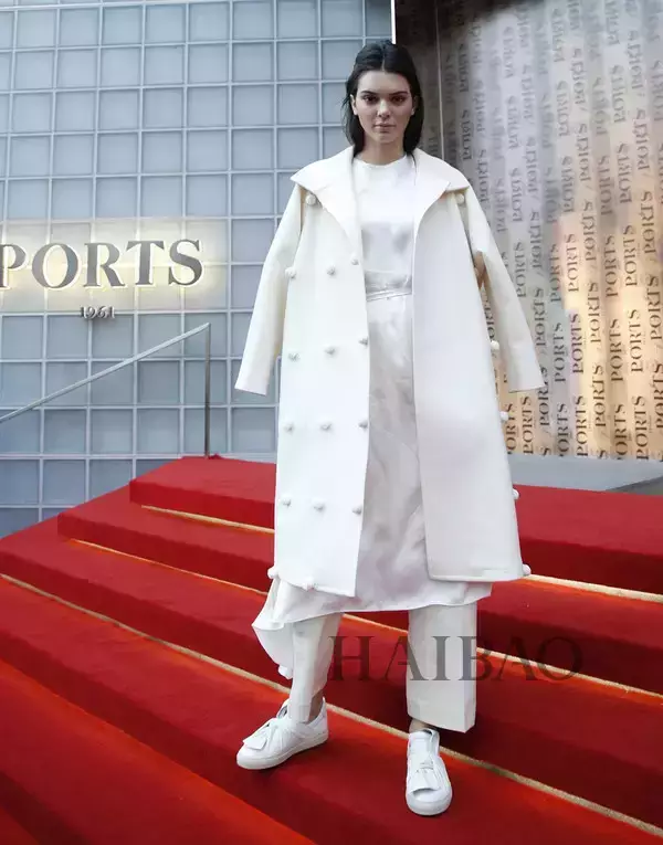 10月13日,金小妹肯达尔·詹娜 (Kendall Jenner) 出席了在上海举办的开幕活动,当天她先是以一身全白Look亮相,肩上披宝姿 (Ports) 乳白色大衣,穿一双小白鞋。后又换上无袖长外套和拼接款直筒牛仔裤,依然脚踩百搭小白鞋。
