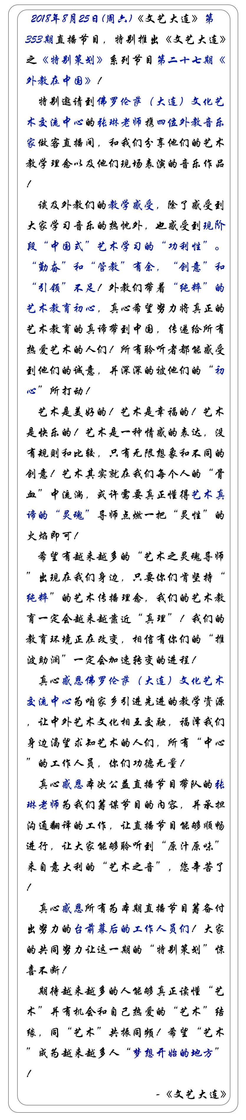 感谢《文艺大连》给我们本次直播的机会,感谢大连,这座美丽的城市带给我们不一样的教学体验。