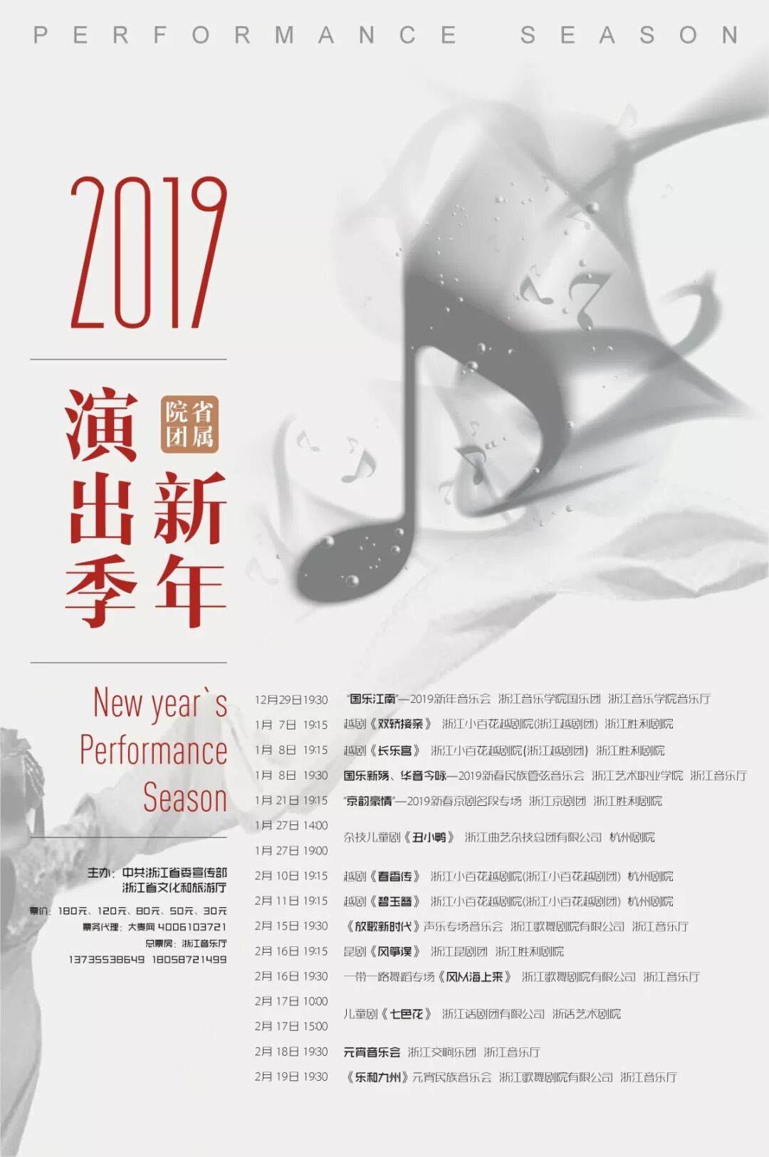 由中共浙江省委宣传部、浙江省文化和旅游厅主办的2019省属院团新年演出季已于2018年12月29日正式启幕,来自省属10家文艺院团、院校自主创排的一批舞台艺术佳作共十四场精彩演出将先后在杭城各大剧院持续上演,涵盖了越剧、京剧、昆曲、交响乐、歌舞、民乐、曲艺、杂技等众多艺术门类,将一直持续至春节农历新年元宵节2月19日的“全新年”,欢迎广大观众订票观演。