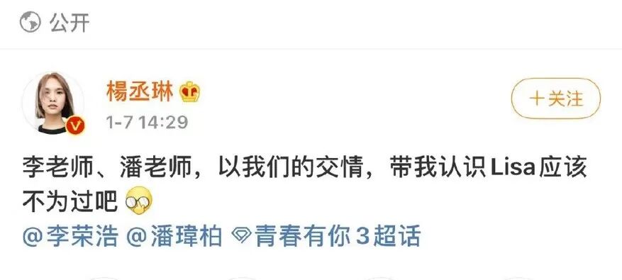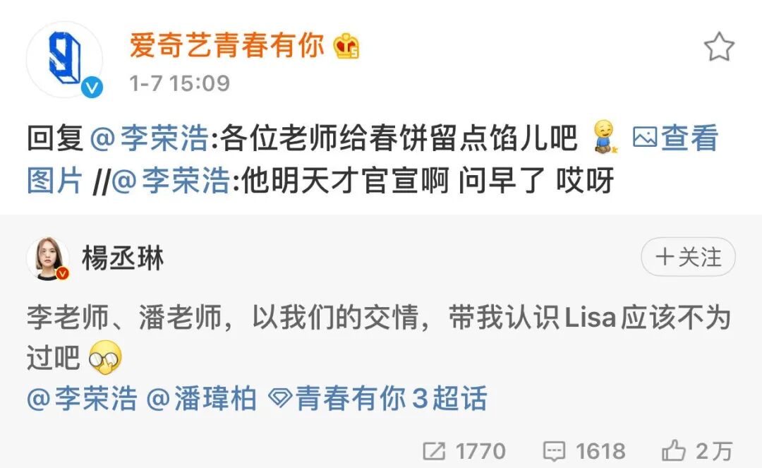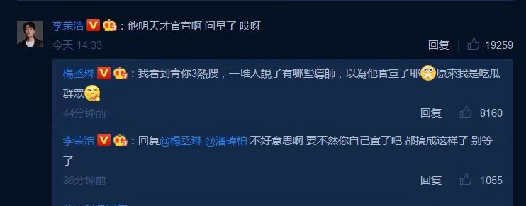 尴尬的是此时第三位导师潘玮柏尚未官宣,杨丞琳在线追星,直接把潘玮柏也给暴露了。李荣浩拆老婆台,称“他明天才官宣啊,问早了”。杨丞琳表示自己看了热搜,一堆人说了有哪些导师,以为官宣了,还表示“原来我是吃瓜群众”。李荣浩立马艾特潘玮柏,让他自己宣了,“都搞成这样了,别等了。”