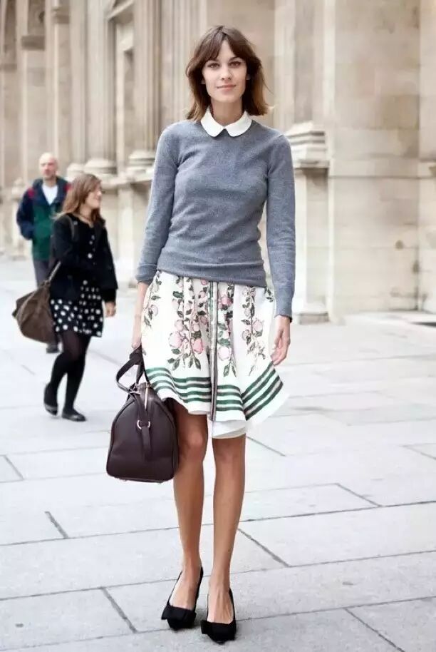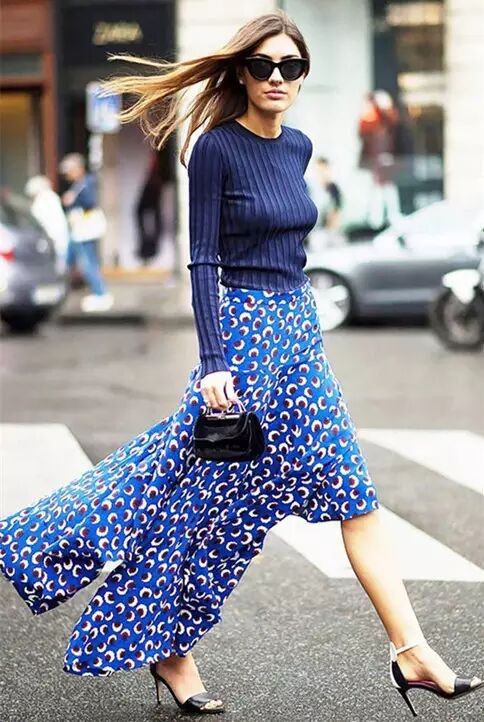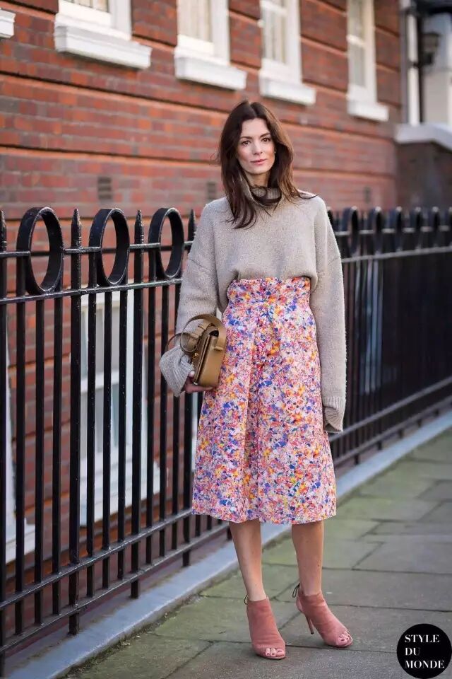 ▼纯色的毛衣+印花半裙,轻松凹出女神范儿~
