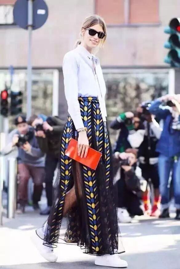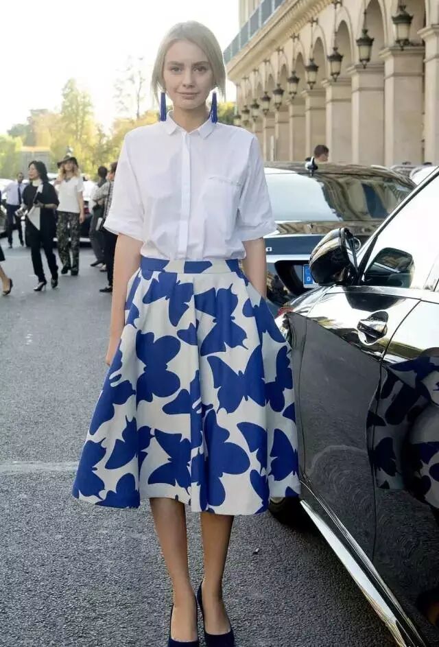 ▼白衬衫+印花半裙,干净简洁,自然又舒服,而且不用担心半裙的款式。