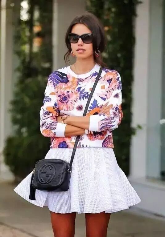 ▼印花上衣+白色A字裙,简单时尚,少女感十足。