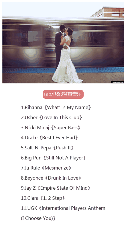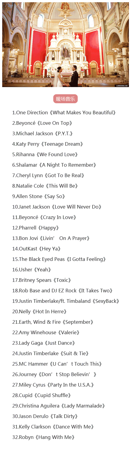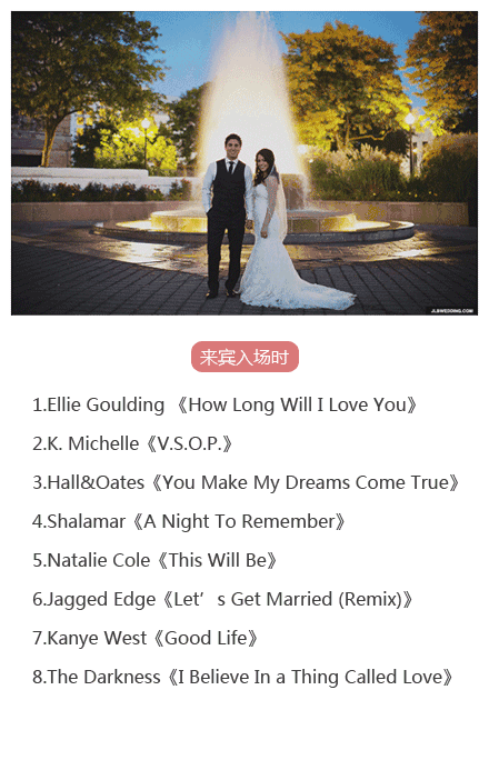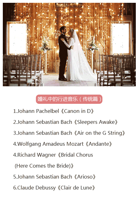 婚礼开场前,宾客陆续入场,这时比较适合播放纯音乐,但切记不可选择太过舒缓或让人昏昏欲睡的古典乐,节奏感强、轻快悦耳为首选。