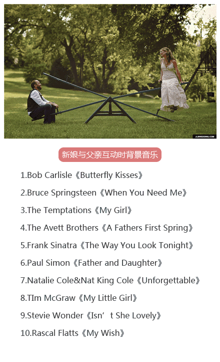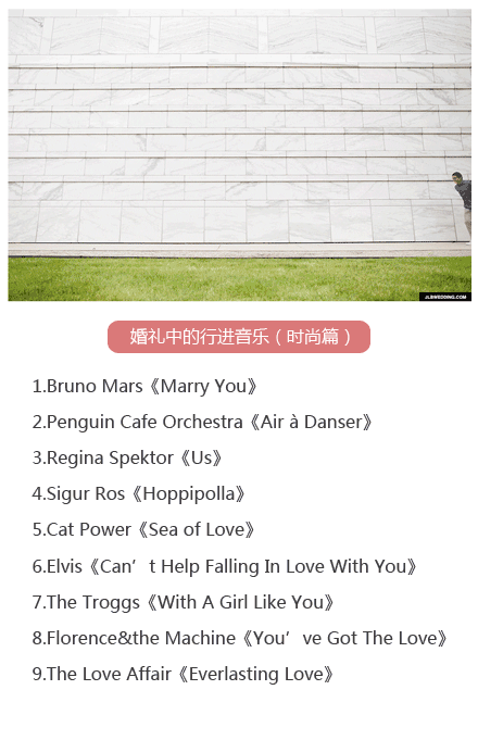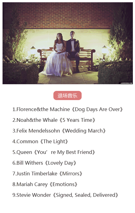 退场时宜选择简单明快的歌曲来引导婚宴的开始,这首不过听几遍都很好听的歌曲,结构简单,旋律清新,意象明亮。