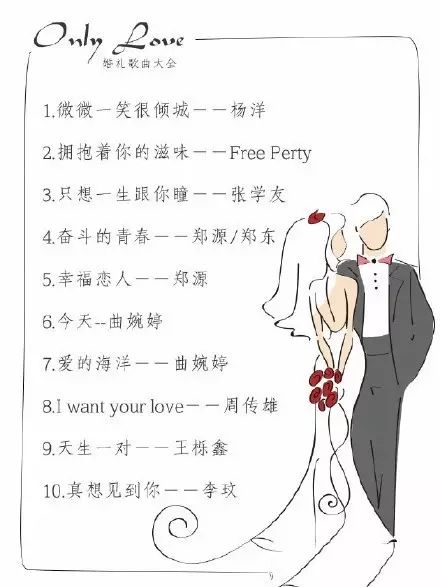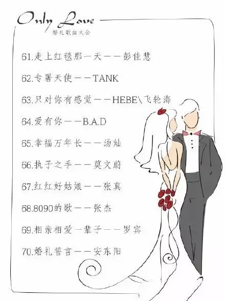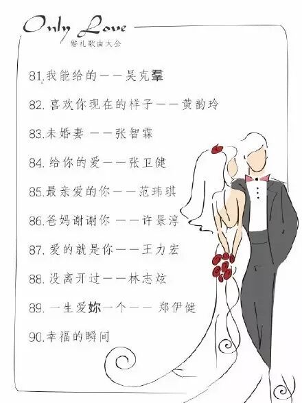 绝对开口跪,男声深沉女声性感,强烈推荐!如果你的婚礼上恰好安排了新娘新郎共舞的时间,这首86拍的歌曲将非常适合那个浪漫幸福的时刻,歌词也非常符合意境。(可惜的是后台只有这首纯音版,先感受下氛围,比起小编推荐的版本可是差远啦~)
