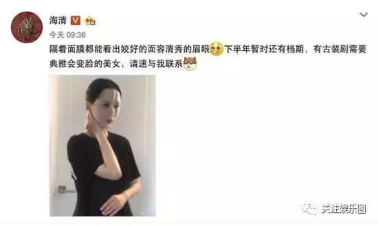 7月27日,海清更新微博,晒出自己身穿黑色宽松T恤,脸贴面膜的照片,并搞怪配文“隔着面膜都能看出姣好的面容清秀的眉眼,下半年暂时还有档期,有古装剧需要典雅会变脸的美女,请速与我联系”。