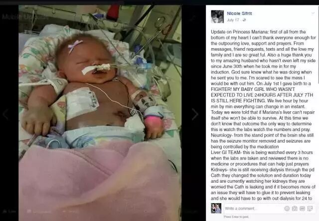 但医生们没有放弃,7月10日他们用急救直升机,将Mariana转到了爱荷华大学医院,三组专家全力对Mariana进行抢救,之后几天里,Mariana的身上被插满个各种针管,Nicole看得心疼不已。