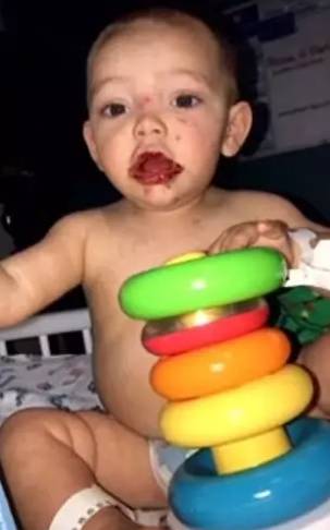 英国14个月大的婴儿,奥利弗被家人亲了一口,全身染上病毒,多处溃疡。