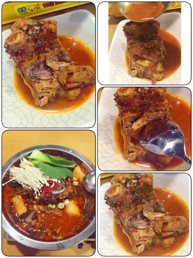 在韩国如果哪家餐厅能把这道菜做绝了,那生意一定红火。首尔日报终于把这道硬菜上了!看图就已经垂涎欲滴了,一大锅(两人份),上来的时候吓坏吃喝君了,量超足。排骨选材只用猪的第2、3块颈骨,肉多且嫩,经过秘制调料腌制一整晚,再用温火熬制四个小时,这款美食才得以出现。肉质嫩到用筷子一夹,肉就脱骨了,无需费劲啃,吃完肉吃一块配料的土豆,口感面到入口即化,再喝一口汤,美味!韩国人喜欢把饭泡在排骨汤里(这个一定要尝试,否则真的会后悔!吃喝君用这个汤汁泡饭足足吃了三碗米!最后是扶着墙出去的..甚至想把剩余的汤汁也打包走,我想我一定是疯了。)但是老板也说因为此菜制作过程过于繁琐,每天只能新鲜熬制两锅,所以!限量20份。要想吃,还是要早些来或者预约的!(只想弱弱的说一句:为什么总有一来首尔日报吃饭就很紧张的感觉….)但为了排骨,值!新老客户,你们一定要来尝一下,力荐,评为新乡最好吃的排骨汤。