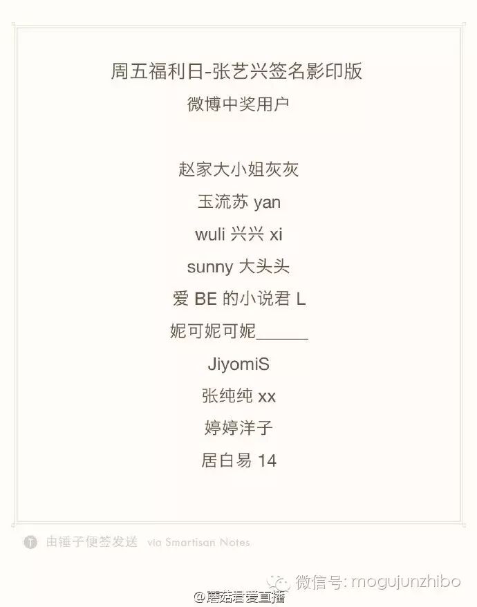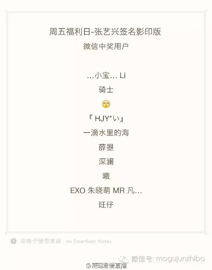 蘑菇开奖啦 张艺兴手绘小蘑菇签名照 20位鸡仔快来领啦! 蘑菇君粉丝直播 内地男星 2016-05-31 20:30:29 572 创作不易,用心坚持,欢迎请BaGua喝几杯爱心咖啡!打赏并支持本文 打赏并删除本文 亲爱的鸡仔们!上周的周五福利日 开奖啦!本期奖品:张艺兴手绘蘑菇签名照 影印版本期微博中奖名单:10人本期微信中奖名单:10人请中奖的同学以 微博私信 & 公众号留言 的方式告知小蘑菇地址。礼物会在10个工作日之内发出。大家一定要耐心等待呦!感谢鸡仔们对蘑菇君的大力支持请多多关注蘑菇君以后还有更多福利嗷!爱你们!摸摸大! 创作不易,用心坚持,欢迎请BaGua喝几杯爱心咖啡!打赏并支持本文 打赏并删除本文 感谢您的支持鼓励,我会继续努力的!文章地址:用户邮箱:打赏金额:USDT 请输入数字点击”去打赏“,即可进行打赏支持本文章哦 张艺兴 About the Author 蘑菇君粉丝直播 功能介绍:蘑菇君粉丝直播,不一样的直播方式。 Related Posts 蘑菇八卦韩红和郭敬明合作了一首歌,为什么惊动了二次元? 2016-09-14 19:20:42 蘑菇开奖啦 张艺兴手绘小蘑菇签名照 20位鸡仔快来领啦! 2016-05-31 20:30:29 发表评论