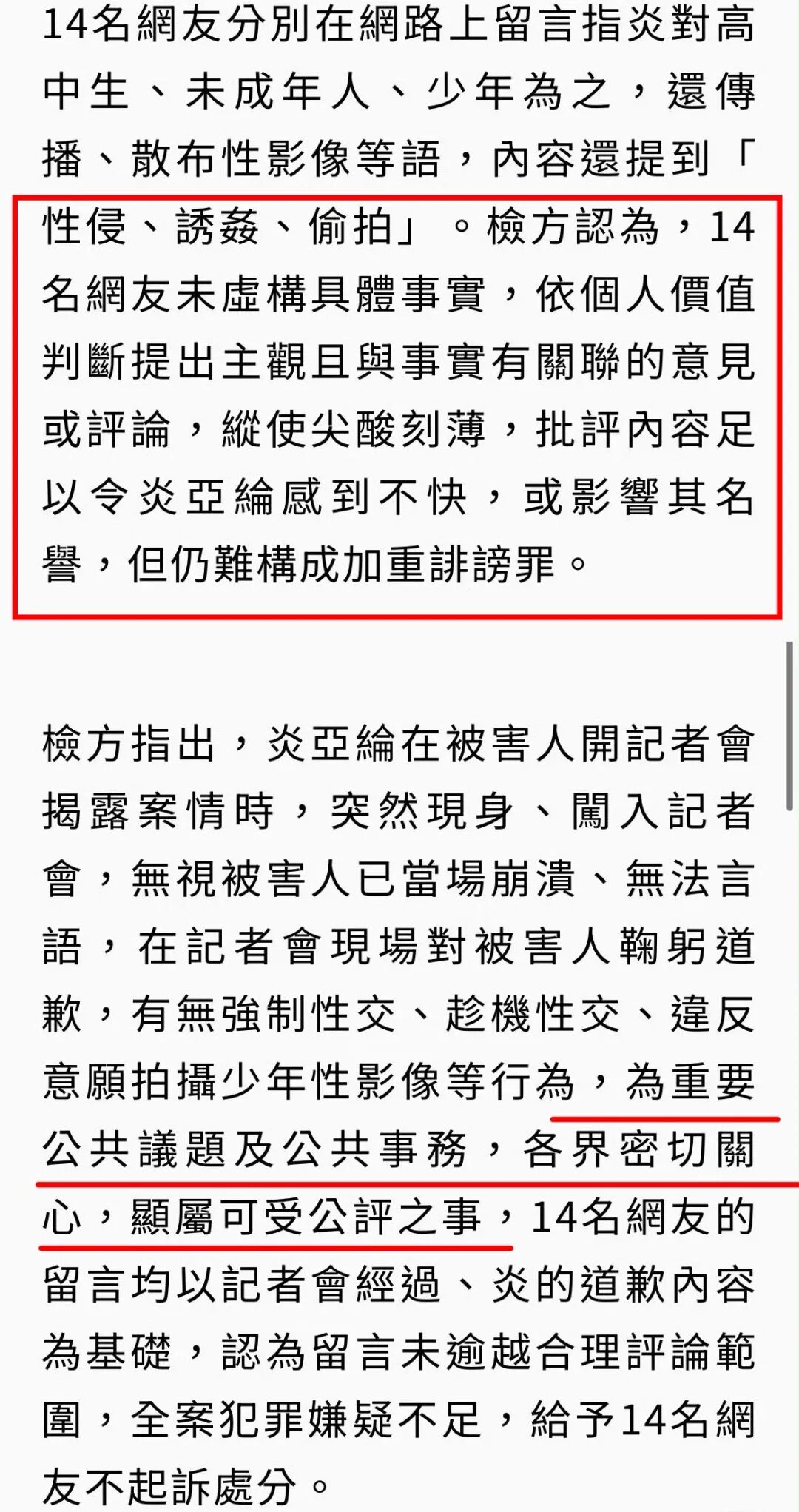 台北地检署认为,网友言论基于司法公开事实,属于可受公评之事。