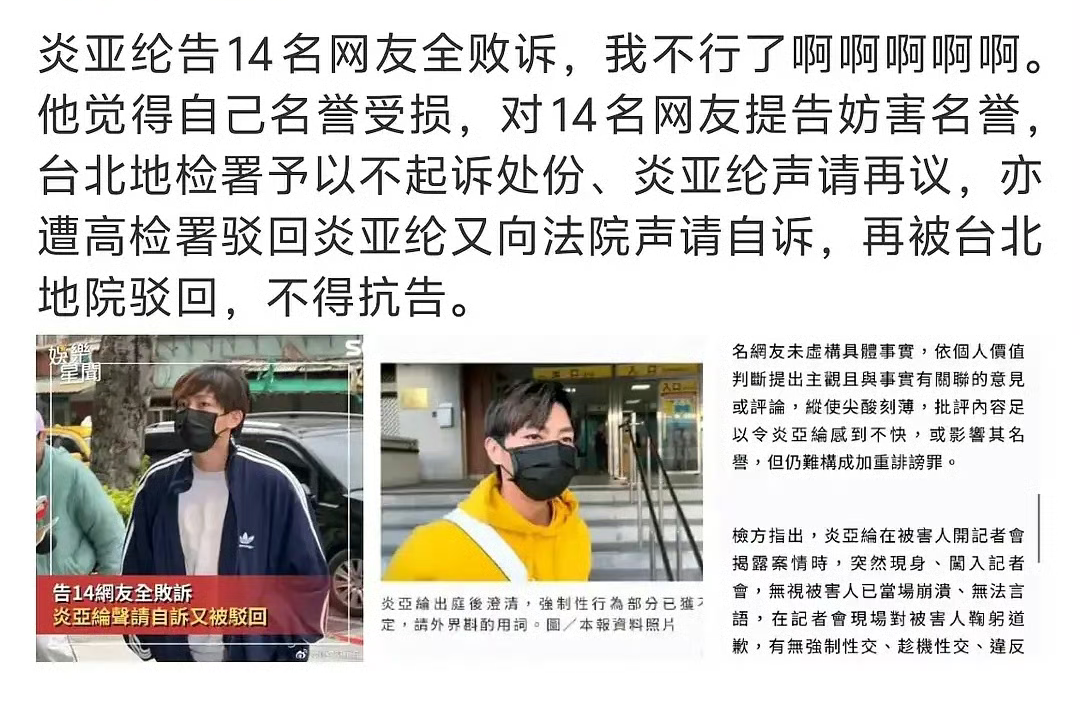 炎亚纶意图以“加重诽谤罪”起诉他们,结果败诉。
