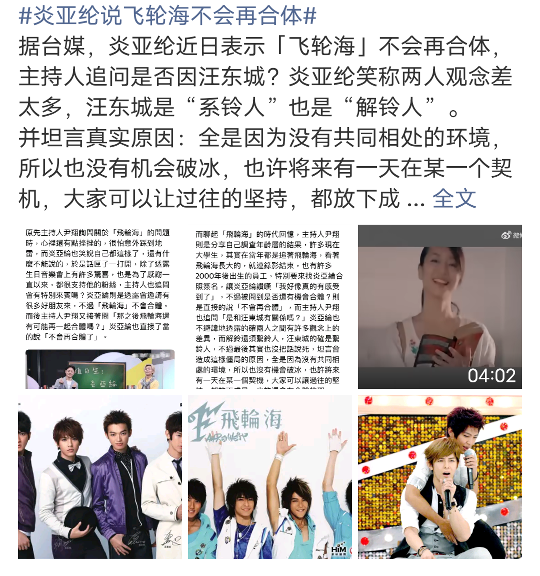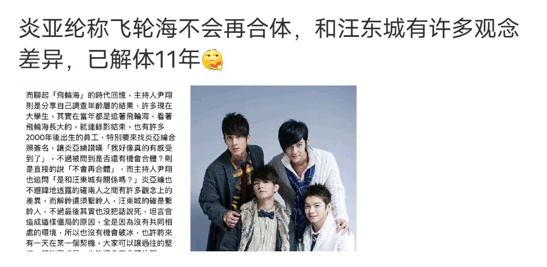后来,吴尊退团,飞轮海其他三人各自发展。虽然标榜着单飞,不解散。实际上,飞轮海早已名存实亡。