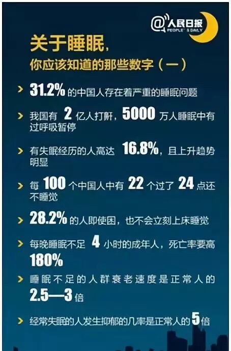 调查显示,我国31.2%的人有严重睡眠问题,22%的人24点后仍不睡,43.2%的人晚睡是因为上网、玩手机。