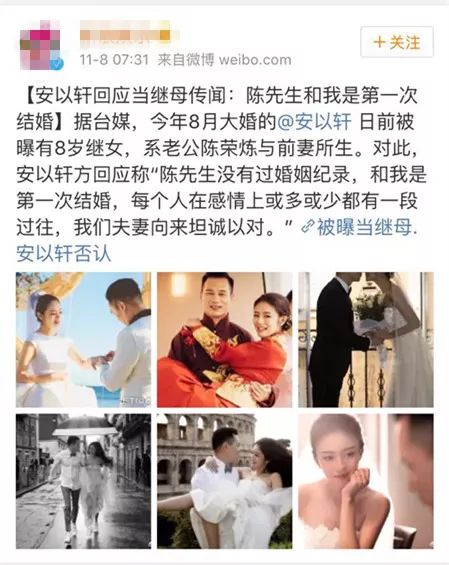 事情是酱紫的,昨天晚上,台湾媒体突然曝出安以轩的老公陈荣炼曾有一段长达十几年的婚姻,并且和前妻有一个8岁的女儿,而安以轩婚前就知道此事,并且相当宽容地接受了这个女儿。
