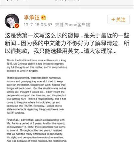 其实这位欧巴发了这么一大段英文,总结起来就是一句话:他在2012年11月4日已经和安以轩分手了!